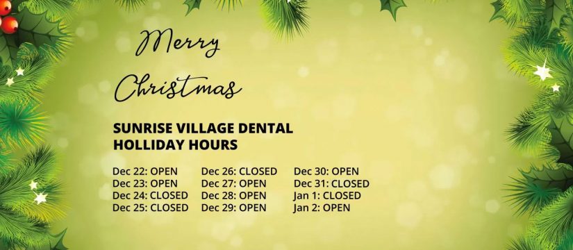 The dentists and staff at Sunrise Village Dental Office would like to wish you and your families all the best throughout the holidays. Our dental clinic will be closed on Christmas Eve, Christmas Day & New Years Day (Dec 24, 25 & Jan 1). Our Holiday Hours: Dec 22: OPEN Dec 23: OPEN Dec 24: CLOSED Dec…